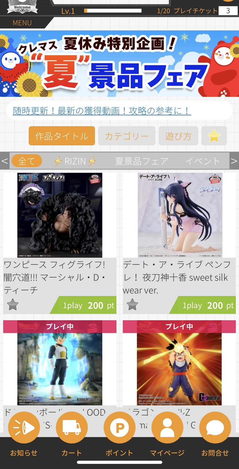 プレイは画面中央にある「作品タイトル」「カテゴリー」や「全て」などから選択ができます。自身が欲しい景品をプレイしていきましょう。「いきなりプレイするのは不安」という方は、次の章で実際に操作している動画を掲載しているので、参考にしてください。