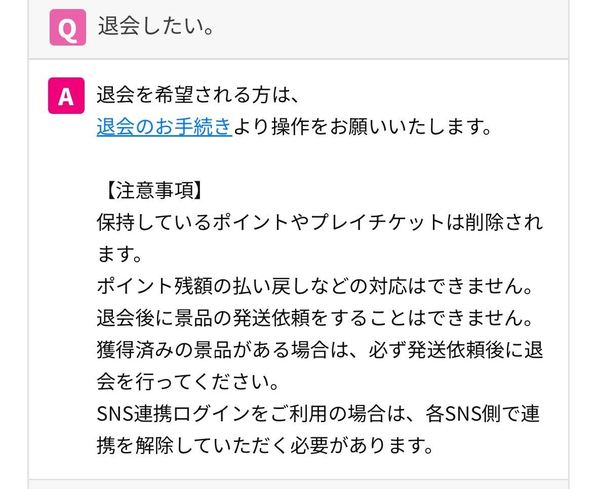 なお、退会すると、保有しているポイントやプレイチケットは消滅します。ポイント残額の払い戻し対応や景品の発送依頼もできません。獲得済みの景品を受け取りたい場合は、必ず発送依頼をかけてから退会手続きを実施してください。