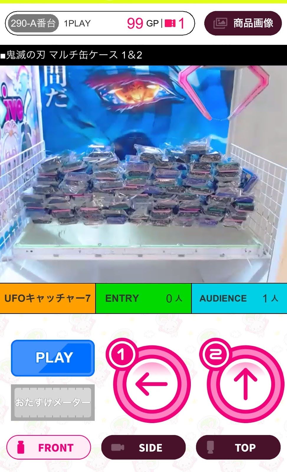 先ほども少し触れたように、各ブースにはカメラが取り付けられています。「FRONT(正面)」「SIDE(横)」「TOP(上)」の3カ所に設置されているカメラを必要に応じて切り替えて、景品やアームの位置を微調整してください。