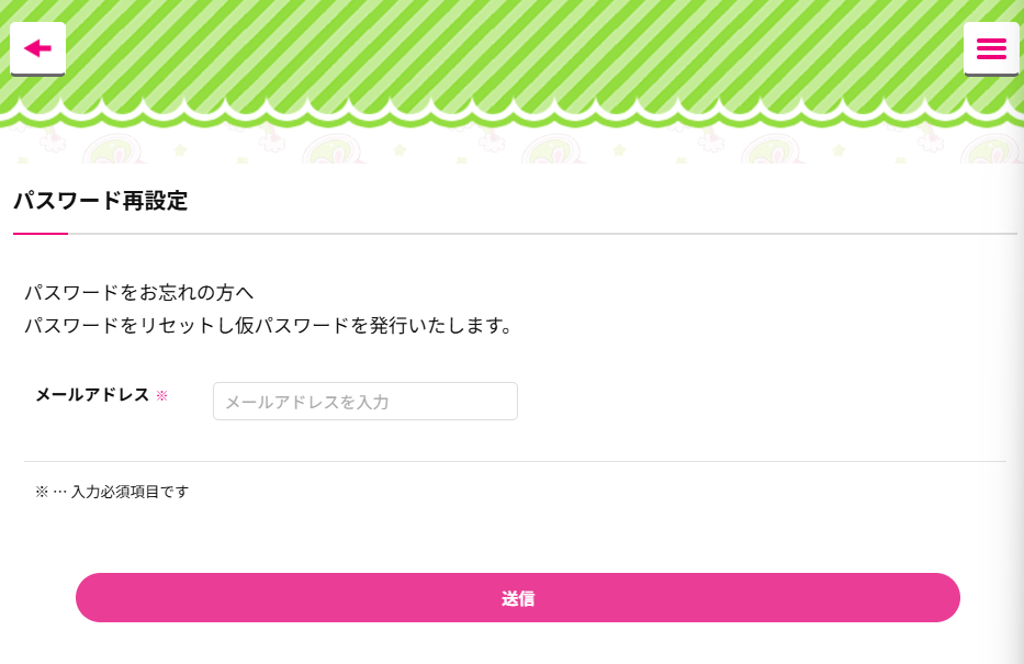 パスワードを忘れてしまった方は、ログイン画面に表示される「パスワードをお忘れの方へ」をクリックし、「ゲットライブ」に登録しているメールアドレスを入力&送信してください。