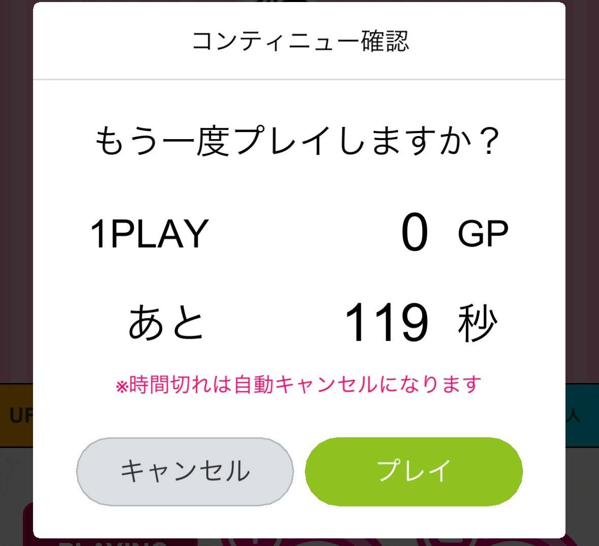 景品を獲得できなかった場合は、再チャレンジOKです。プレイが終了するとコンティニュー確認画面が出て「もう一度プレイしますか?」と尋ねられますので、続行したい場合は「プレイ」をタップしましょう。「キャンセル」をタップするか残り時間が0秒に達すると、プレイ終了です。