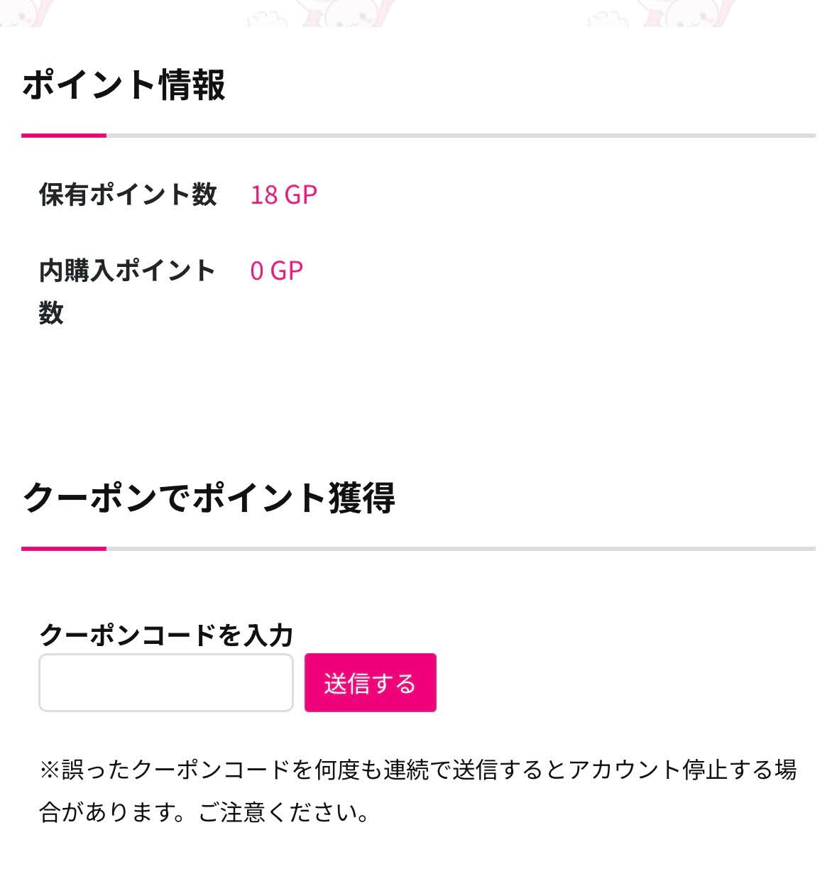 「クーポンでポイント獲得」の下にある空欄にクーポンコードを入力して送信すると、ポイントをもらえます。なお、誤ったクーポンコードを何度も連続送信するとアカウントが停止される場合がありますので、注意しましょう。