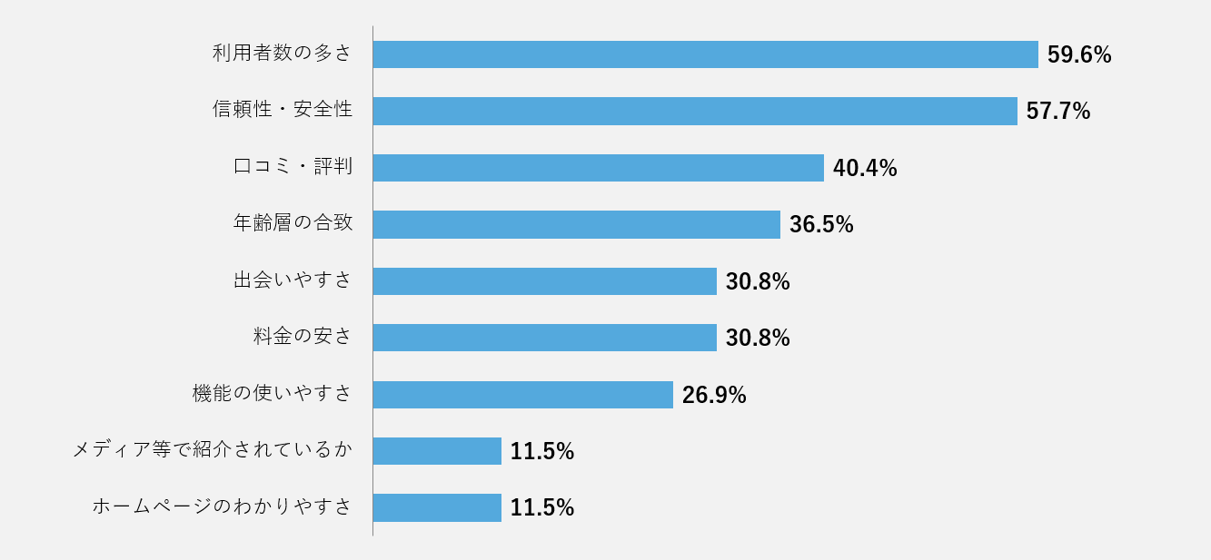 「利用者数の多さ」を重視すると答えた人が59.6%と最も多く、「信頼性・安全性」の57.6%、「口コミ・評判」が40.3%と続きます。「年齢層の合致」は36.5%となりました。