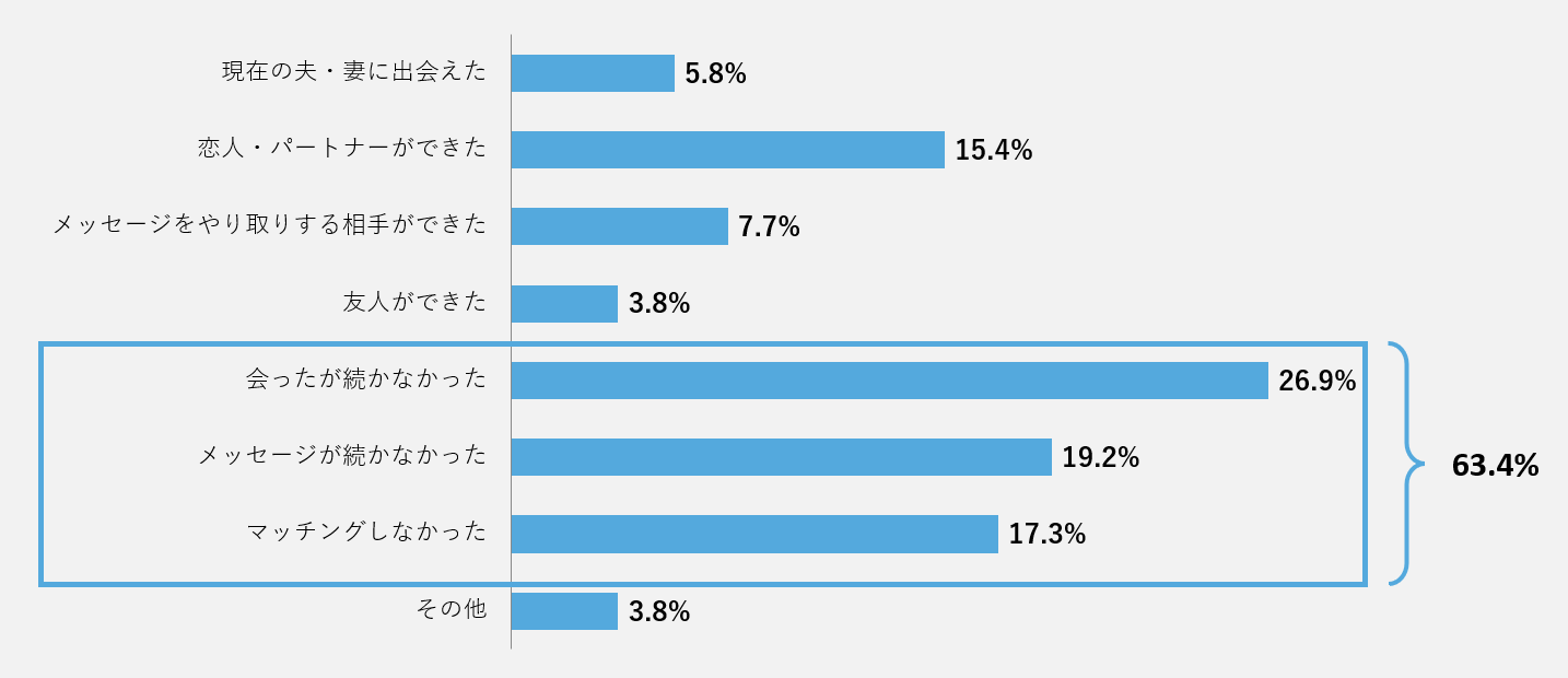 恋人やパートナー、友人、結婚相手に出会えたと回答したのはおよそ25%。メッセージのやりとり相手との出会いを含めても、およそ30%とどまります。「マッチングしなかった」、または「マッチングはしたもののメッセージが続かなかった」と回答したのはいずれも22.8%。