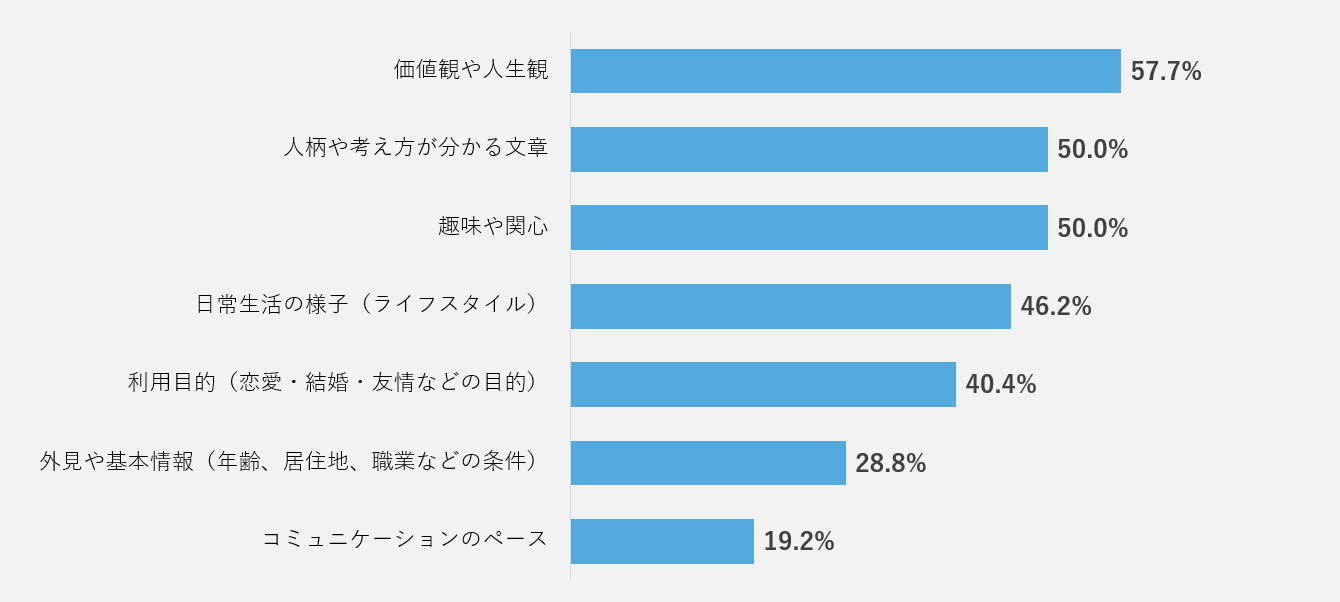 「価値観や人生観」が57.6%、「人柄や考え方が分かる文章」「趣味や関心」はいずれも50%、「日常生活の様子(ライフスタイル)」が46.1%となりました。