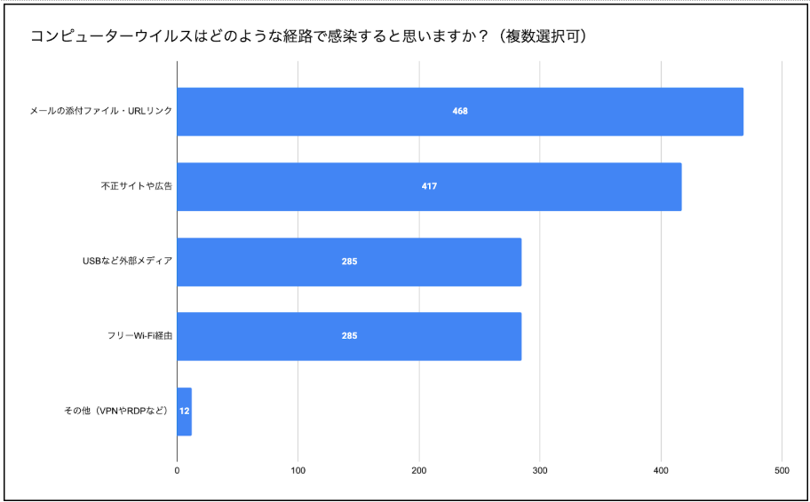 一般ユーザー500名に「コンピューターウイルスの感染経路(複数選択可)」を尋ねたところ、「メールの添付ファイル・URLリンク」(約90%)が突出し、次いで「不正サイトや広告」(約80%)となりました。