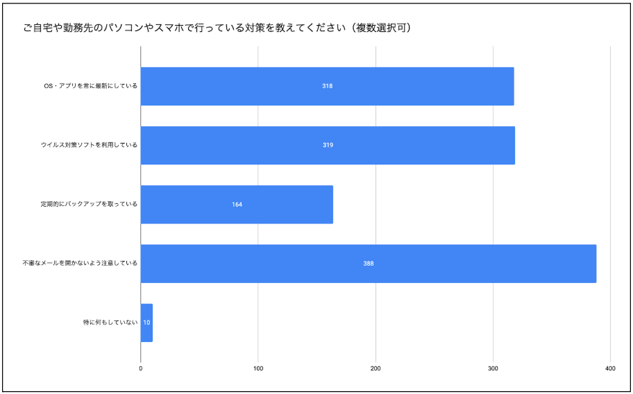 しかし、具体的な対策(複数回答)を見ると、「ウイルス対策ソフトの利用」は約60%、「定期的なバックアップ」はわずか約30%に留まりました。